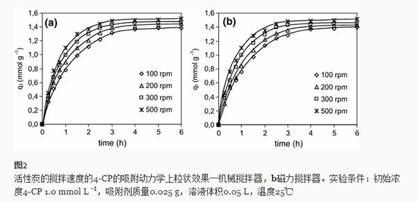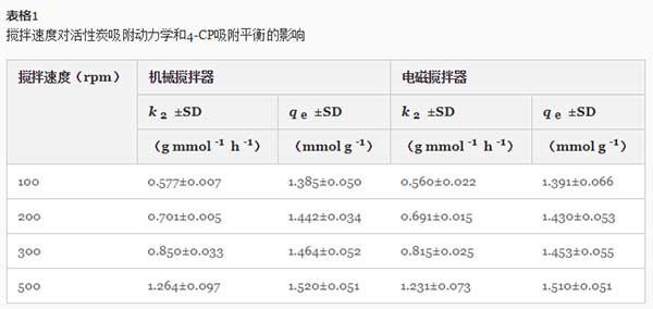表1中的數據 也表明,攪拌速率不僅影響吸附動力學,而且影響4-CP從水中的去除效率。吸附容量從1.385增加到1.520 mmol·g -1(機械攪拌器)和從1.391增加到1.510 mmol·g -1(磁力攪拌器),攪拌速度從100增加到500rpm。觀察到從20.06 4-CP的吸附容量的增加至23.04毫克克-1攪拌速度從300到600轉。然而,一些作者已報道,用增加攪拌速度只能達到一定的限度,超過此有在吸附容量無顯著增加吸附增加。在一些情況下,觀察到在更高的攪拌速率在吸附容量的降低。正如作者所提出的,這是由于這樣一個事實,即在非常高的攪拌速度下,吸附分子和吸附劑顆粒的動能增加到足以使它們相互碰撞而導致分離松散結合的吸附分子。