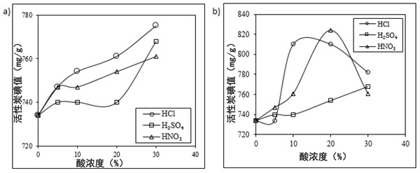 圖1:酸的濃度對活性炭碘值的影響,在(a)18°C和(b)50°C下進行酸洗化學活化。