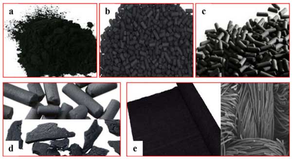 圖1:活性炭的形式:(a)活性炭粉末,(b)顆粒狀活性炭,(c)擠出活性炭,(d)浸漬活性炭,(e)活性炭布。