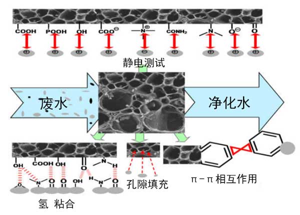 應該注意的是,對活化過程的理解是優化活性炭制備的基本步驟。實際上,各種化學,物理和物理化學方法被用于從不同的天然或合成資源合成活性炭。化學處理涉及通過浸漬然后熱解使用活化劑,而物理過程涉及在蒸氣或二氧化碳存在下的高溫熱處理。但是,這兩種方法的組合也已用于生產活性炭。根據所采用的處理方法,很難預測碳的物理化學和形態特性。看來形態,物理化學,質地,通過改變活化時間和溫度以及所用前體的性質,活性炭的表面性質會發生顯著變化。活性炭表面的化學性質取決于存在于表面上的雜原子的類型,例如氧,氮,硫等。這些積累在表面上的雜原子或基團要么來自原材料本身,要么在活化過程中被引入。這在很大程度上與前體的性質有關。所有這些特性對于使用碳作為水溶液中污染物的吸附劑具有重要意義。實際上,污染物在活性炭上的吸附是一個復雜的過程,在涉及物理作用和/或化學鍵的過程中,各種相互作用可以共存。從而,可能發生的吸附機理為靜電相互作用,氫鍵,π-π堆積相互作用,孔填充,疏水相互作用,離子交換以及其他相互作用(n-π相互作用等)和絡合反應。圖2說明了在活性炭上吸附污染物的主要相互作用方法。