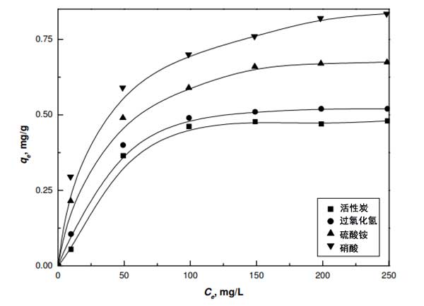 用活性炭和改性活性炭進行平衡吸附實驗,以評估它們使用合成的鎳廢水從水性介質中除去二價鎳的能力。通過用0.1g活性炭與50mL濃度范圍為10mg/L至250mg/L的Ni(II)溶液平衡進行實驗,結果顯示在圖2中。活性炭的每克吸附容量值按以下順序增加:活性炭>過氧化氫>硫酸銨>濃硝酸。氧化活性炭的容量增加是由于存在大量酸性基團,其可以與水溶液中存在的陽離子鎳交換它們的質子。