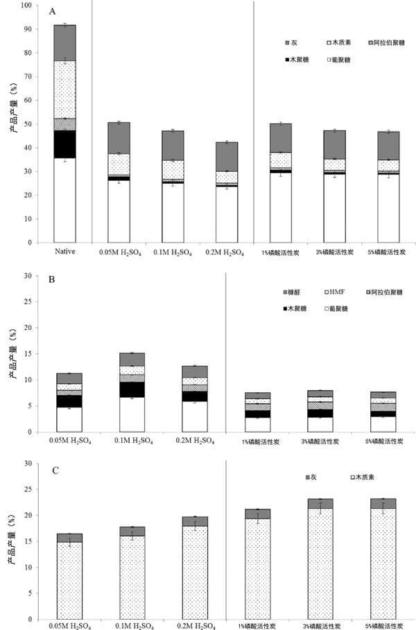 圖2:磷酸加入活性炭的濃度對(duì)生物質(zhì)分離的影響(A)固體部分,(B)含水部分,(C)有機(jī)部分。
