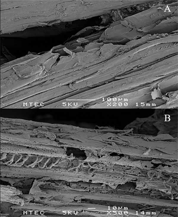 如圖3所示,將通過(guò)分離獲得的固相微結(jié)構(gòu)通過(guò)SEM與天然RH進(jìn)行了比較。活性炭原材料提供了正常且完整的表面,表明植物材料的高度有序的完整結(jié)構(gòu)(圖3A)。分離的固體殘余物的生物質(zhì)的表面結(jié)構(gòu)顯示出表面和內(nèi)部結(jié)構(gòu)的破壞,并具有空腔和裂紋。該觀察結(jié)果表明半纖維素的去除和表面木質(zhì)素的改變。對(duì)于BET表面積測(cè)量,分析了原始和預(yù)處理的生物量樣品。