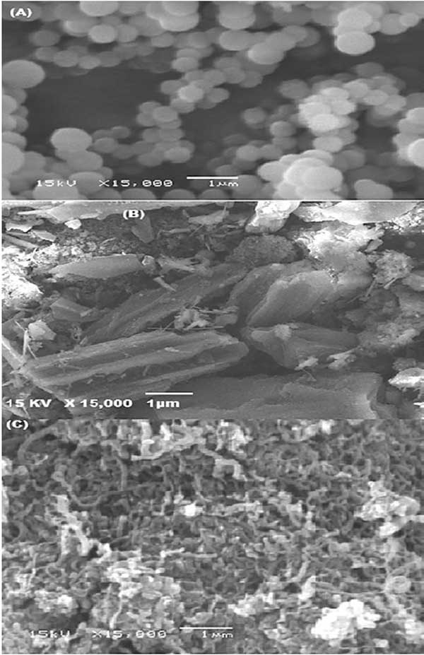 這種方法是檢查活性炭表面形態的有用方法。圖1A和1B展示了丙烯腈-共聚苯乙烯(A)和活性炭浸漬后的(B)SEM照片。這些圖顯示了球形、均勻形狀的結構,改性方法導致改性復合顆粒尺寸增加了7.95%。此外,圖1C顯示了制備的納米碳管的SEM圖片。該圖顯示了未處理樣品中存在無定形碳。此外,值得注意的是,這些管子又細又長,并且沒有大量凝聚在一起。納米碳管的管狀直徑介于75和99.25nm之間。