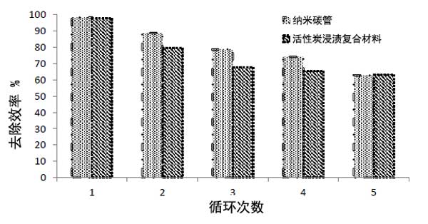 活性炭復合材料的再生具有經濟重要性。該實驗涉及許多吸附-解吸循環,以估計重復脫色對納米材料吸附效率的影響。發現納米碳管和活性炭浸漬材料對活性紅的去除效率略有變化,如圖3所示。數據顯示原始納米碳管和活性炭浸漬材料存在差異與不同初始活性紅染料濃度下重復使用的納米化合物相比;钚约t的吸收程度在第一個循環后達到98.18%,然后在五輪納米碳管后降低到62.72%,而對于活性炭浸漬材料,第一個循環去除效率為97.72%,在第一個循環后,在五輪后降低到63.18%,表明其再生有效性,如圖3所示。因此,可以得出結論,納米碳管和活性炭浸漬材料的吸附過程會受到延長重復使用周期的影響,而不會損失大量染料吸附能力。因此,兩種納米化合物被多次用于從水性階段去除活性紅染料。因此,這表明它們可以多次使用,證明了它們的經濟可行性。