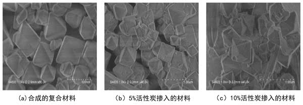 (2)SEM結果表明,三種樣品具有相似的規則八面體結構,但活性炭的加入會導致活性炭摻復合材料晶體表面出現一定缺陷。