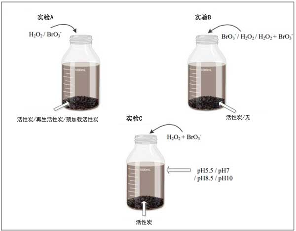 在對(duì)50家飲用水公用設(shè)施進(jìn)行的調(diào)查中,獲得過(guò)氧化氫和溴化物的平均值來(lái)當(dāng)做測(cè)試用水。在所有實(shí)驗(yàn)中,批量反應(yīng)器都用薄箔包裹。制備0.052µmol/L溴酸鈉溶液并加入間歇反應(yīng)器中以獲得0.5µmol/L溴酸鹽的濃度。高級(jí)氧化工藝中的出水殘留過(guò)氧化氫濃度不會(huì)超過(guò)180µmol/L。因此,在本研究中,將150µmol/過(guò)氧化氫加入到間歇式反應(yīng)器中。如圖1所示,在23–27℃的環(huán)境溫度下,使用36個(gè)批次玻璃瓶進(jìn)行了一系列實(shí)驗(yàn)。活性炭用量始終為5g/L,過(guò)氧化氫和溴酸鹽濃度始終分別為150µmol/L和0.5µmol/L。所有裝有過(guò)氧化氫的間歇式反應(yīng)器都用鋁箔覆蓋,以防止過(guò)氧化氫被光潛在降解。在如圖1所示的實(shí)驗(yàn)中,使用16個(gè)間歇式反應(yīng)器和三種不同的活性炭(活性炭、再生活性炭和預(yù)加載活性炭)來(lái)研究不同運(yùn)行時(shí)間的活性炭對(duì)溴酸鹽和過(guò)氧化氫的去除,該實(shí)驗(yàn)涉及八個(gè)處理組。
