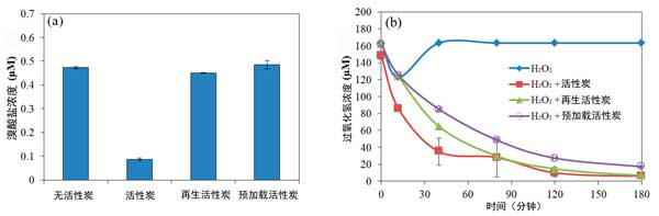 圖2:(a)溴酸鹽和(b)過(guò)氧化氫被不同類型的活性炭去除。