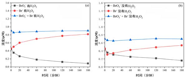 圖3:各種溴酸鹽與不存在和存在過(guò)氧化氫的情況下的濃度(a)有過(guò)氧化氫,(b)沒(méi)有過(guò)氧化氫。