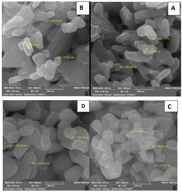 未活化的活性炭與物理活化的活性炭復合材料的合成使用水熱法制備了。根據該方法,金屬化氧化鐵銅納米粒子懸浮在30mL燒杯中,直接加入活性炭懸浮液,超聲處理30分鐘。然后將這兩種懸浮液在一個燒瓶中混合,在80℃下連續攪拌,直到溶劑完全蒸發。此時,收集所得固體并在100℃下干燥12小時獲得活性炭復合材料。利用掃描電鏡對合成的這幾種活性炭材料的表面形貌進行了研究。純氧化鐵銅納米粒子的表面形態如圖1A所示,它顯示了中等均勻的球形顆粒,粒徑約為31nm。活性炭復合材料的圖像如圖1C所示,該圖像顯示了較小的均勻性,粒徑相對較大,并且存在顆粒團聚。這很可能是由于復合材料中存在活化后的活性炭,這可以增強表面協同效應,促使顆粒尺寸增加,因為在這些條件下晶體生長。復合材料氮鐵銅的圖像如圖1D所示,從該圖像可以看出,存在相對均勻的分布,球形顆粒幾乎與氧化鐵銅相似,但氧化鐵銅氮的粒徑相對大于氧化鐵銅。這可能是由于摻雜氮物種后晶體生長所致。