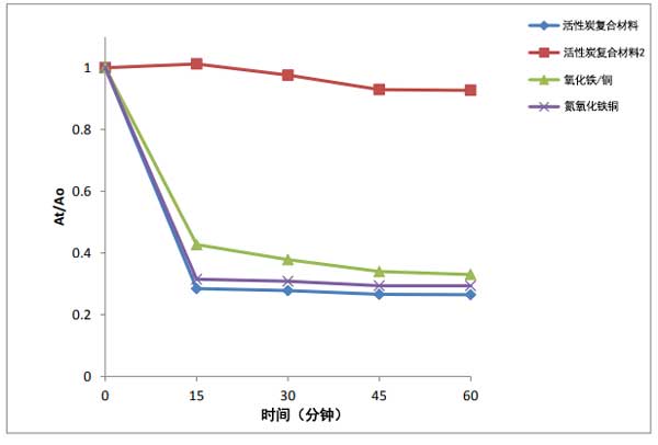 通過在復合材料上吸附去除模擬工業廢水中的俾斯麥棕色G染料,研究了制備的活性炭復合材料的吸附能力。所有實驗均使用50ppm、150mL、0.15g的俾斯麥棕色G染料濃度進行。和pH值為5的染料溶液。俾斯麥棕色G染料對制備的納米復合材料的吸附結果如圖2所示。從這些結果可以看出,在相同吸附條件下,與其他吸附劑相比,活性炭復合材料的吸附效率最好。這很可能是由于與活性炭復合材料和氮氧化鐵/銅相比,與本研究中使用的不同吸附劑相比,這種三級復合材料具有更高的BET表面積。