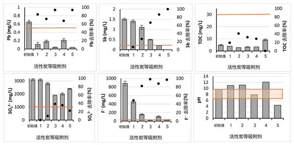 圖2:活性炭等吸附劑的篩選。廢水中污染物的數量顯示在主y軸上的列中,污染物減少量顯示為次要y軸上的黑點。橙色線是水道排放的限值。