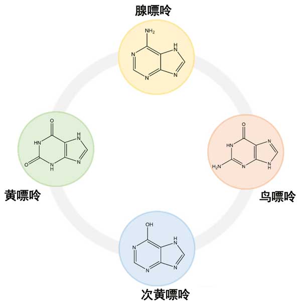 嘌呤化合物在所有生物體中都至關重要。嘌呤,其是指取代的嘌呤和各自的互變異構體,如示于通過嘧啶的融合和咪唑環形成的,雜環芳香化合物(圖1)。這類化合物包括堿基、核苷和核苷酸,一些例子是腺嘌呤、鳥嘌呤、次黃嘌呤和黃嘌呤(圖2)在哺乳動物中,嘌呤更常見地表達為核酸,例如核糖核酸和脫氧核糖核酸(分別為RNA和DNA),它們包含兩個嘌呤堿基腺嘌呤和鳥嘌呤,以及幾種單分子核苷酸,如ATP、ADP、單磷酸腺苷(AMP)和環磷酸腺苷(cAMP),以及在較小程度上,鳥苷三磷酸(GTP)和環磷酸鳥苷(cGMP)。