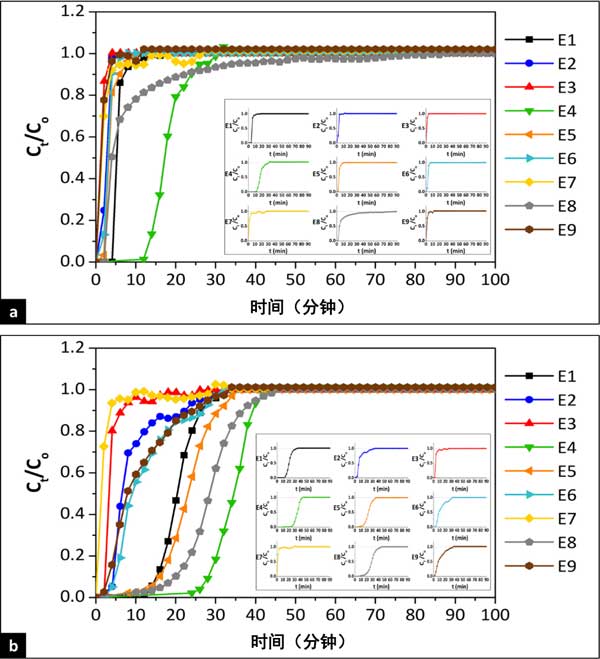 圖2:使用活性炭吸附(a)環己烷和(b)苯的突破曲線。
