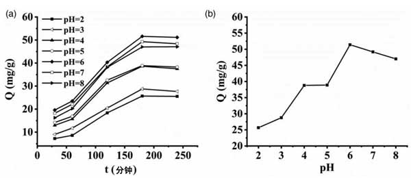 圖1:(a、b)不同pH值對(duì)吸附劑的影響和不同pH值下的大吸附容量。