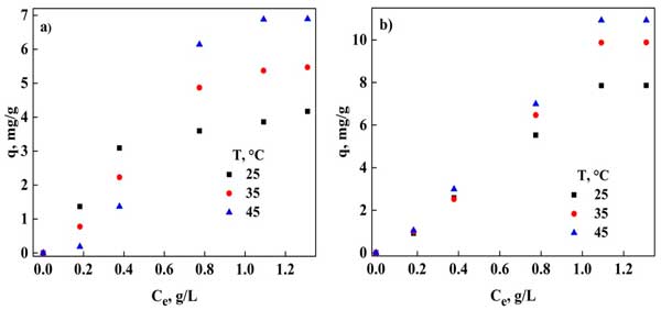 平衡吸附分析使我們能夠獲得不同等溫線模型的參數(shù),表明在去除污染物時進(jìn)行了何種類型的過程。在圖1中,顯示了使用粉末活性炭(圖1a)和活性炭(圖1b)在不同溫度下DNS的吸附能力。還觀察到3,5-二硝基水楊酸在兩種吸附劑中的吸附都隨著溫度的升高而顯著影響,隨著溫度的升高呈現(xiàn)出更大的吸附。因此,在45℃時,活性炭和粉末活性炭的大吸附容量分別為6.97和11.57mg/g。這可能是由于去除過程的環(huán)境,這會導(dǎo)致吸附劑表面隨著溫度的升高而增加其對3,5-二硝基水楊酸吸附的參與。使用商用活性炭的文獻(xiàn)中也報道了類似的行為。在其他研究中,使用這種吸附劑還觀察到,基于苯酚、高氯酸鹽和重金屬等的不同化合物的吸附能力有所增加。