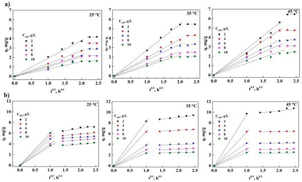 外部和粒子內(nèi)傳質(zhì)過程的分析可以對3,5-二硝基水楊酸的吸附產(chǎn)生顯著影響,在去除3,5-二硝基水楊酸時可能存在由于物質(zhì)傳輸造成的限制,這有必要對這種現(xiàn)象進(jìn)行分析。圖2a是以外擴(kuò)散模型為基礎(chǔ)構(gòu)建的,從中可以看出,對于活性炭,在吸附過程中接觸長達(dá)6小時的實(shí)驗點(diǎn)處存在一條直線,這表明存在以下可能性,在任何溫度的過程中通過外部傳質(zhì)控制。圖2b顯示了粉末活性炭在3,5-二硝基水楊酸吸附中獲得的實(shí)驗數(shù)據(jù)的表示,其中在與吸附劑接觸1小時時觀察到一條直線。這表明使用活性炭粒子不存在外部傳質(zhì)問題,因為3,5-二硝基水楊酸會迅速從溶液中去除,擴(kuò)散到表面。此外,這表明活性炭顆粒中的吸附過程可能是由于表面存在的官能團(tuán)。根據(jù)這些結(jié)果,確定是否也存在內(nèi)部傳質(zhì)問題很重要,從而能夠確定3,5-二硝基水楊酸刪除過程是否受到這種現(xiàn)象的存在的顯著影響。