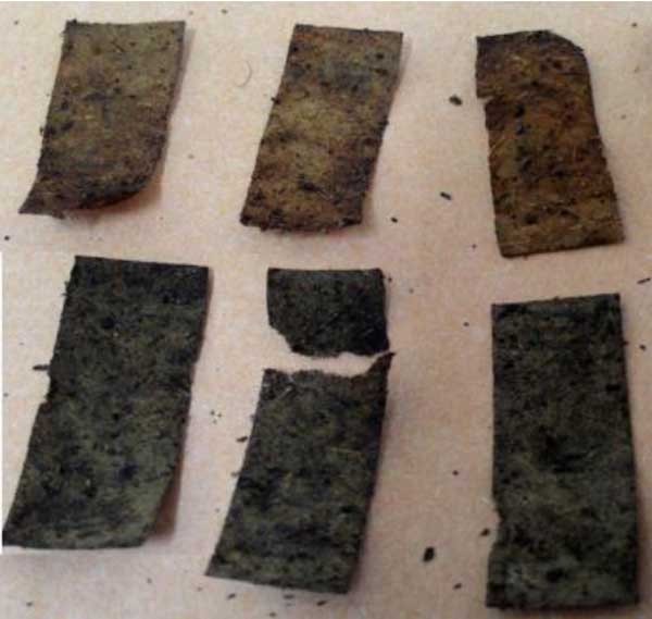 圖2:觀察12周后的紙形態(tài),無納米活性炭的紙(上)和含有納米活性炭的紙(下)。