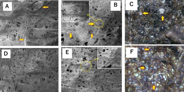 圖3:紙表面的顯微外觀(50倍放大),(A)在生物降解測(cè)試前帶有納米活性炭/纖維素紙;(BC)經(jīng)生物降解試驗(yàn)后的納米活性炭/纖維素紙;(D)纖維素紙僅在生物降解試驗(yàn)之前;(EF)纖維素紙僅經(jīng)過生物降解測(cè)試。黃色狹窄對(duì)應(yīng)于來自土壤的真菌菌絲體,插入的圖像放大250倍。