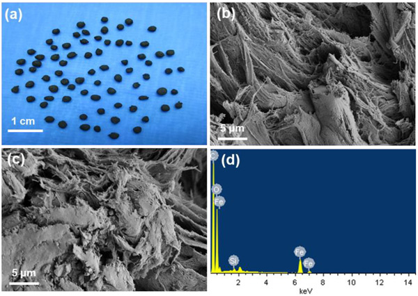 圖2:(a)磁性活性炭珠的照片。(b)活性炭的SEM圖像。(c)SEM圖像和(d)磁性活性炭珠樣品的EDX光譜。