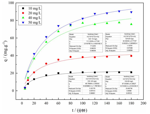 根據(jù)動力學方程,當溫度為25℃且改性活性炭用量為8g/L時,擬一級動力學和擬二級動力學分別用于擬合。發(fā)現(xiàn)二階動力學方程的擬合效果更好,結果如所示圖2。