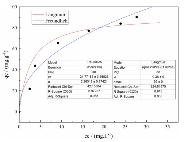 當反應溫度為25℃,投加量為8g/L時,可獲得不同初始濃度下亞硝基二乙胺的平衡濃度和改性活性炭的平衡吸附容量。使用Langmuir和Freundlich熱力學方程對數(shù)據(jù)進行擬合,結果如所示圖3從圖中可以看出,吸附過程不符合Langmuir等溫線方程,F(xiàn)reundlich吸附等溫線方程也適用。當初始濃度達到一定值時,吸附趨于平衡并達到飽和。