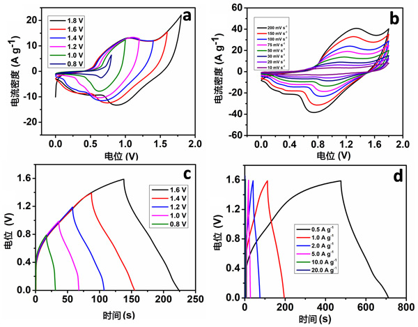 超級電容器裝置的制造是集成陰極(氧化鎳),陽極(活性炭)使用纖維素濾紙(在2.0M/KOH電解液中浸泡放置)分離,然后用絕緣膠帶包裹。陽極和陰極具有相似的幾何表面積,再經(jīng)過合適的重量比來制成電容器。圖2a顯示了超級電容器件在各種截止區(qū)域中的CV曲線,掃描速率為50mVs-1。從圖中可以看出,電容器件的CV曲線呈現(xiàn)出典型的準矩形電容性能,這對應于雙電層電容器和贗電容的相互貢獻。此外,當增加工作截止區(qū)時,會發(fā)生更多的法拉第電化學反應。當工作電位超過1.7V時,也會在CV曲線上注意到氧氣的釋放。活性炭/氧化鎳器件很大程度上取決于截止區(qū)域。因此,選擇1.6V作為隨后研究超級電容器件電化學性能的潛在窗口區(qū)域。圖2b顯示了活性炭電容器件在0到1.6V的截止區(qū)域內(nèi)的各種掃描速率下的CV曲線。電流密度隨著掃描速率的增加而增加,并且氧化峰電位轉(zhuǎn)移到更正的電位,類似三電極器件的結果。