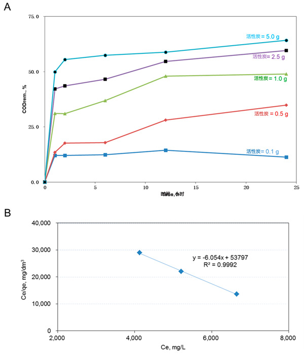 圖1:使用過的活性炭的吸附特性。(A)去除的COD百分比與用于吸附染色廢水COD的活性炭量的關系圖。(B)Ce/qe比率與Ce的關系圖。