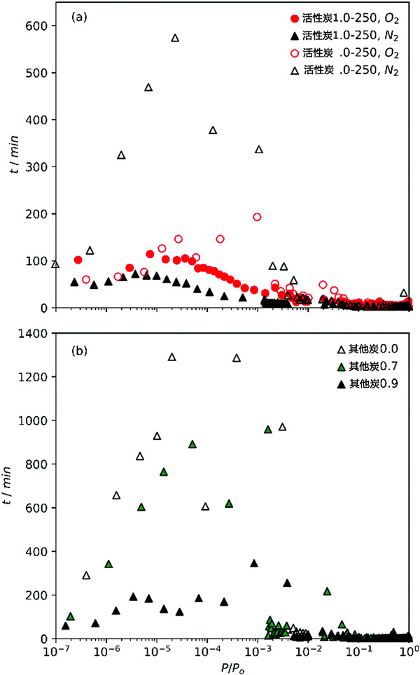 圖1:(a)O2和N2等溫線在活性炭上的相對壓力增加和(b)N2等溫線其他炭的點之間的時間。