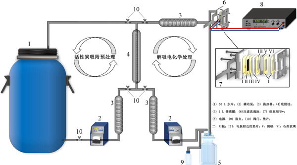 制備含有300mg/L-1苯的甲醇溶液和含有50mmol/L-1電解質(H2SO4)的水介質,以確定污染物的去除效率。初始pH值約為1.5,在電化學過程測試期間未觀察到顯著變化。使用包含電極作為陽極和鈦板作為陰極的單隔室壓濾流動池(在圖1中詳細表示)進行電解,其具有13.5cm2的明顯幾何面積。兩個電極由墊片隔開,距離為4毫米。使用含有1L溶液的夾套玻璃容器,蠕動泵以1L/min-1的速度將溶液泵入熱交換器,然后循環通過電池。使用恒溫浴將溫度控制在25℃。在恒電流模式下以50mA/cm-2的電流密度進行電解。使用前,將陽極在H 2 SO4/0.05mol/L-1溶液中以40mA/cm-2極化20分鐘, 以從其表面去除任何雜質。電化學實驗一式三份進行。
