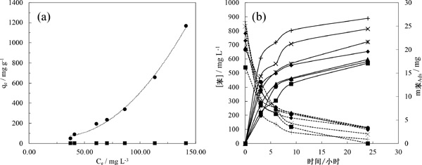 圖3:苯在水和甲醇中的吸附等溫線(a)和苯(b)在0.030L甲醇中不同量的活性炭中的吸附等溫線。左軸甲醇上的苯濃度和右軸活性炭中剩余的苯質量。