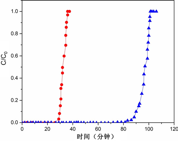圖4:活性炭(黑色實(shí)心圓圈)和堿處理的活性炭(黑色實(shí)心三角形)在35℃下填充床柱中HCl吸附的突破曲線。