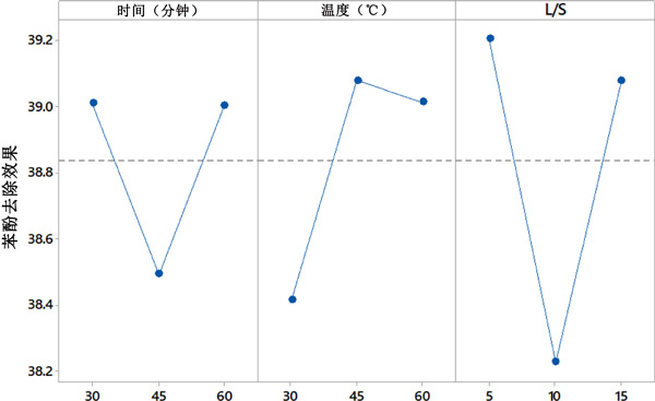 田口法用于優化參數,即時間、溫度和L/S,這些參數直接取決于苯酚的去除。選擇田口方法的選項越大越好。本研究的主要目的是活性炭從廢水中去除較多的苯酚,因此選擇了越大越好的選項。此外,采用添加劑模型來確定各個輸入參數對去除苯酚濃度的影響。這種分析稱為因子效應的確定,結果見圖2。