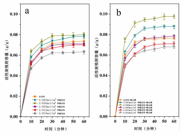 圖2:相同溫度和濕度和不同改性方法下活性炭的靜態吸附曲線。(a)相同溫度和濕度下不同濃度草酸改性活性炭的水蒸氣靜態吸附曲線。(b)相同溫度和濕度下不同濃度草酸+酯水解改性活性炭的水蒸氣靜態吸附曲線。