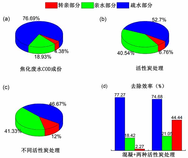 圖1:(a)焦化廢水中溶解有機(jī)物組合的比例(b、c)混凝和活性炭處理后溶解有機(jī)物組合的比例(d)混凝聯(lián)合活性炭處理對(duì)溶解有機(jī)物組合的去除效率。