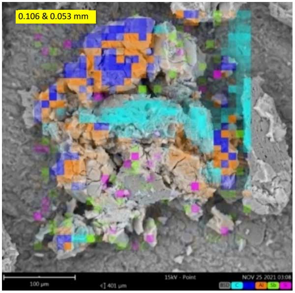 水性介質最終溶液中的元素通過測定。溶液中存在的元素可以來自電極氧化、活性炭孔隙中的元素提取以及水介質中使用的硬水中的元素。在測試中,由于電凝過程中的廣泛氧化,Fe水平低于Fe量化限值(0.01mg/L)。使用0.106毫米大小的活性炭顆粒的電凝工藝在鋁電極上實現了比鐵電極更均勻的涂層,如750倍和600倍放大率下的活性炭顆粒的SEM圖像所示(見圖1)。活性炭結果中存在的多元素在王水中消解并通過ICP-OES表征,通過電極的氧化、活性炭顆粒的凝聚和水介質硬水中所含金屬的吸附而增加。