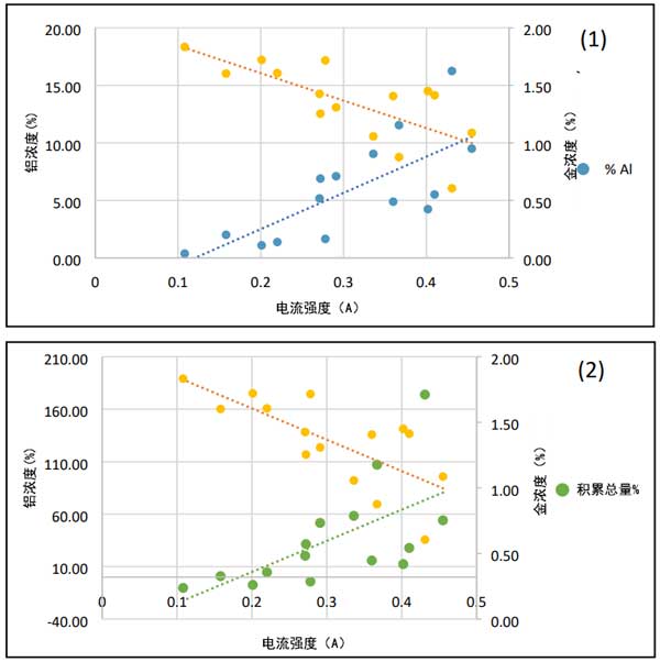 圖3:電流強度與鋁和金濃度(1)的關系圖,以及電流強度與總累積重量和金濃度(2)的關系圖。
