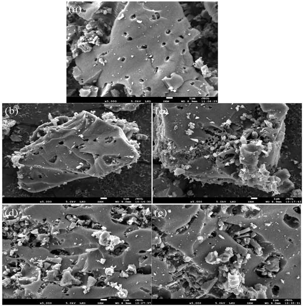 圖1:(a)未改性活性炭、(b)改性活性炭1、(c)2、(d)3和(e)4的SEM圖像。