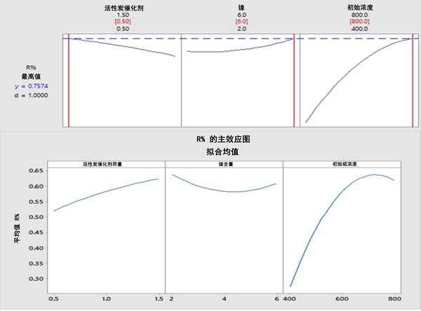 圖2:研究變量對二苯并噻吩轉化率的影響,轉化率隨著活性炭催化劑用量和初始硫濃度的增加而增加,隨著Ni負載量的增加而降低(上圖)。對于活性炭催化劑用量、Ni負載量和初始硫濃度,在0.5g、6%和700ppm時,最佳二苯并噻吩轉化率分別為75.74%(下圖)。