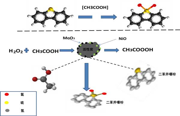 為了更好地理解H2O2/CH3COOH體系在NiO-MoO3活性炭催化劑存在下的氧化脫硫機理,假設存在NiO作為助催化劑,而MoO3作為活性相,反應由MoO3引發,涉及過氧化氫的水解裂解產生強氧化劑(活性羥基自由基(OH•),這些活性自由基攻擊乙酸產生過乙酸,為二苯并噻吩提供氧氣生產二苯并(含有S=O)并進一步攻擊產生二苯并噻吩(含有O=S=O)。