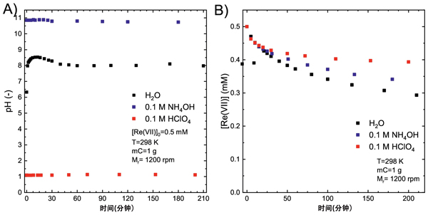 在不同溶液中解吸的動力學曲線。在過程的初始階段解吸率最高。當大約91%的金屬解吸到0.1M/HClO4中時,計算最終濃度。在這種情況下,錸化合物的再溶解與解吸一起發生。水的特點是解吸率最低;只有15%的Re被解吸。在0.1M/NH4OH的情況下,3小時后的最終濃度為0.093mM,38%的Re被解吸。然而,0.1M/NH4中的錸濃度OH在解吸的第一個小時內增加,之后略有下降。