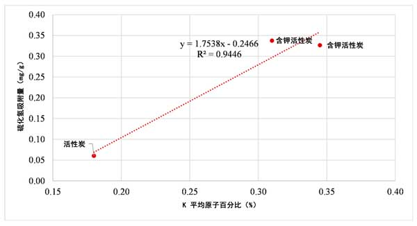 圖3:活性炭中氧化鉀含量對硫化氫吸附的影響。