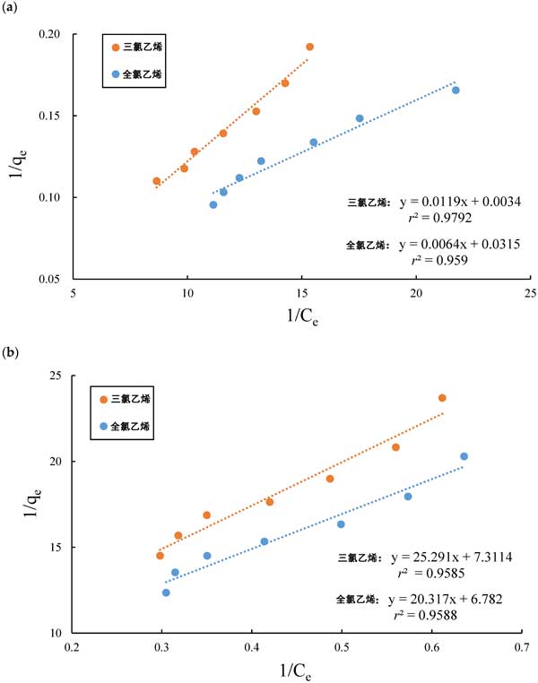 圖2:(a)活性炭和(b)硅膠吸附氯代有機化合物的實驗數(shù)據(jù),符合Langmuir等溫線的線性形式。