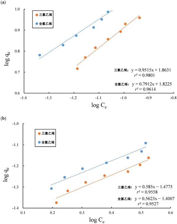 圖3:(a)活性炭和(b)硅膠吸附到氯代有機化合物上的實驗數(shù)據(jù),符合Freundlich等溫線的線性形式。