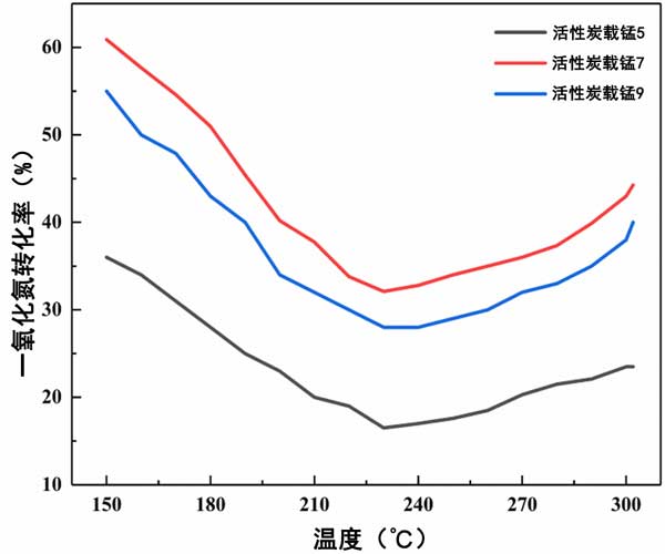 活性炭催化劑低溫CO+NH3耦合脫硝實驗在固定床反應器中進行圖2。脫硝前,將8g活性炭載錳5、活性炭載錳7和活性炭載錳9置于溫度范圍為150–300℃的反應器中。加熱速率設置為10℃min-1。當爐溫達到150℃時,出現模擬煙霧。初始時間設置為0分鐘,反應時間為15分鐘,期間每3秒記錄一個數據點。模擬煙氣設置:NO流量4mL/min-1,CO流量16mL/min-1,NH3流量4mL/min-1,O2含量9%(體積比),N2是平衡氣體。脫硝尾氣采用煙氣分析儀進行檢測。