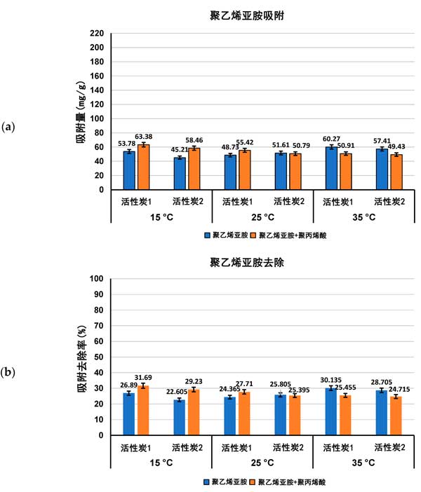 圖2:聚乙烯亞胺吸附量(a)及其從活性炭表面去除的百分比(b)在單一和混合吸附物系統(tǒng)中,在三個檢測溫度pH3下。
