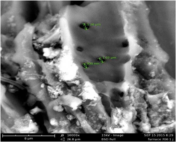 由于上述陶瓷膜去除污染物的多重優勢和有前途的特性,分析陶瓷膜中不同活性炭和氧化鐵粉末含量的影響。使用掃描電子顯微鏡研究活性炭材料的微觀結構。圖1描繪了使用ZnCl2/50vol%在10,000倍放大倍數下活化后的活性炭的孔隙。發現活性炭的孔徑顯示尺寸范圍在0.93μm–1.26μm之間。