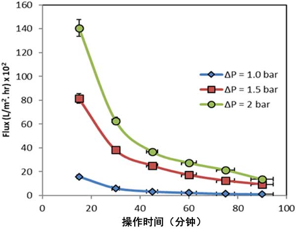 圖3:在不同的操作時間和壓力下滲透通量。