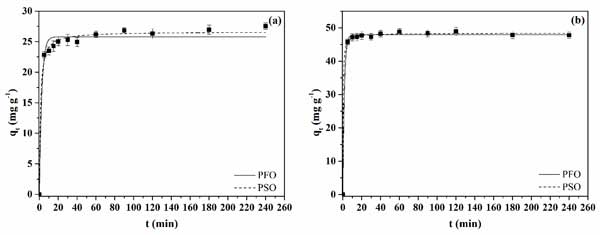 研究了初始吸附物濃度為50mgL-1和pH4的兩種活性炭的亮藍染料染料吸附動力學行為。作為時間函數的吸附容量曲線分別如圖3a、b所示,分別為活性炭1和2?梢杂^察到活性炭2獲得的曲線的特征在于更快的吸附速率;钚蕴2在大約10分鐘內達到平衡。對于活性炭1,在大約60分鐘內達到平衡。由于活性炭1呈現的較高總孔體積,可以解釋這種行為。高孔體積可以通過允許染料分子在孔內更快地擴散到吸附位點來增強吸附動力學。