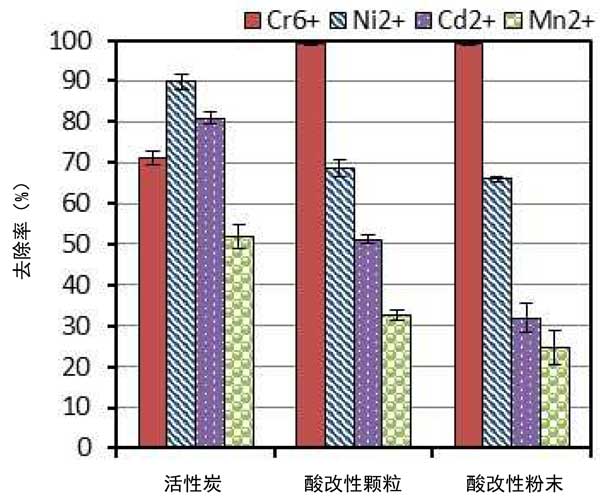 顆粒活性炭的酸處理與未處理的活性炭相比,Cr6+去除效率提高了30%,而Ni2+、Mn2+和Cd2+分別降低了23%、36%和37%。這可以通過(guò)與其他離子相比更高的離子勢(shì)和Cr6+的小尺寸來(lái)解釋。這將導(dǎo)致Cr6+對(duì)酸性表面基團(tuán)的吸引力更強(qiáng),并更快地?cái)U(kuò)散到活性炭的孔隙中。高正電的Cr6+離子會(huì)吸附在孔隙邊緣的酸性功能位點(diǎn)上,排斥其他較弱的重金屬離子,降低它們對(duì)活性炭孔隙的可及性。